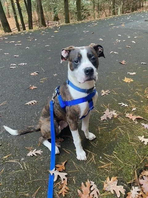 Jack enjoys long walks in the woods, snuggling on the couch and entertains himself with squeaky toys. Jack gets along with the other dogs in his foster home and would need to meet any future siblings to ensure a good fit. Jack is 100% crate trained. Jack is learning his manners in his foster home and would benefit from obedience training.